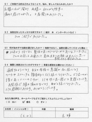 お蔭様で膝も痛みがなくなり、曲がる様になりました。