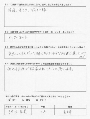 腰痛、肩こりが良くなって良かったです。